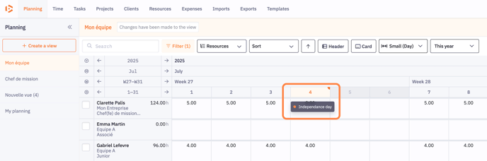 Beeye allows you to display non-working days, such as holidays, directly in the planning. These days are marked with a small orange triangle in the corner of the cell, and the name of the holiday appears when hovered over. This makes it easy to identify non-available periods and plan tasks efficiently while optimizing resource management.