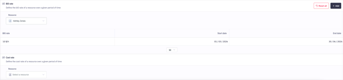 A resource’s cost rate and bill rate are configured in Settings to account for their effective dates, ensuring accurate management over time.