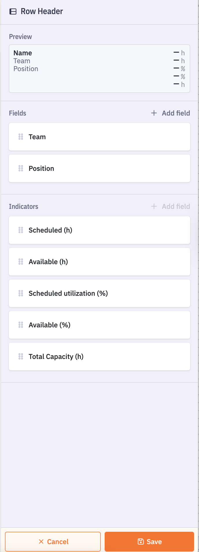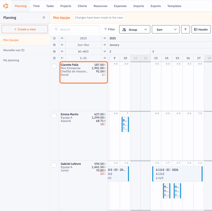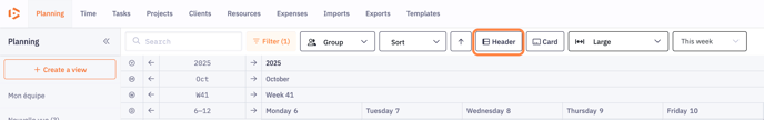 The planning header allows you to display key information and select the most relevant indicators for your analyses. Customizing it makes the planning view clearer and facilitates decision-making.