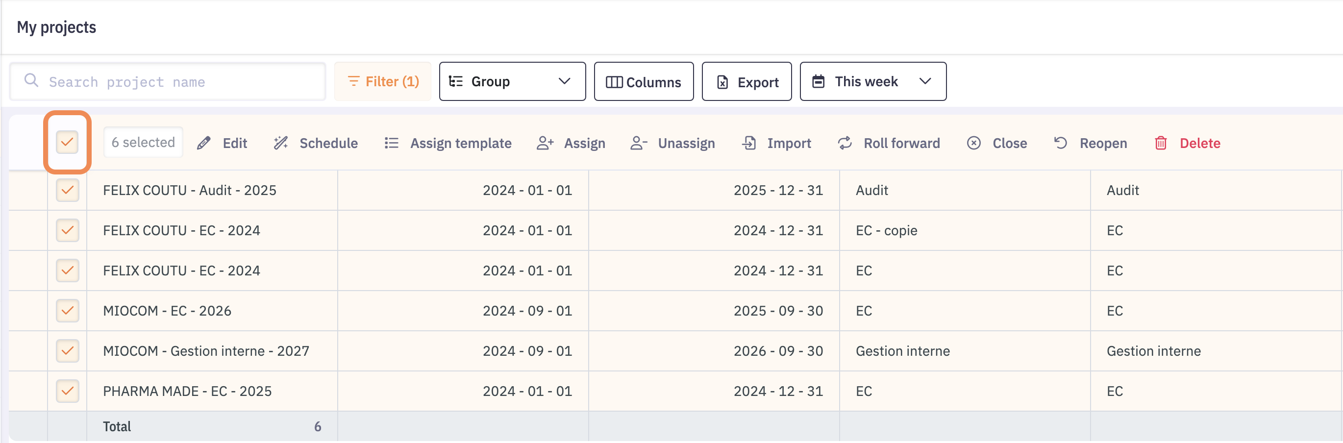 Click the Select All checkbox at the top-left corner of the table to select all rows on the current page.