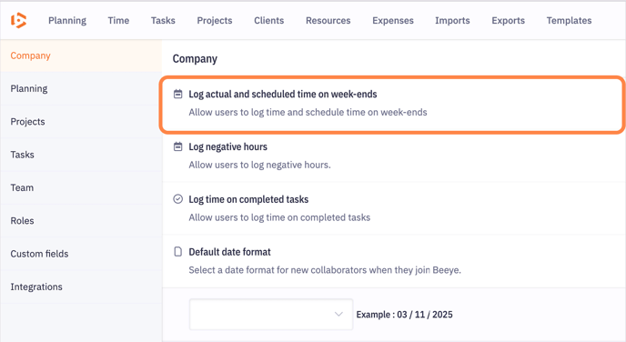 - Activating Weekends: An administrator must go to Settings > Company to activate the option named Log actual and scheduled time on week-ends.