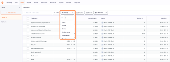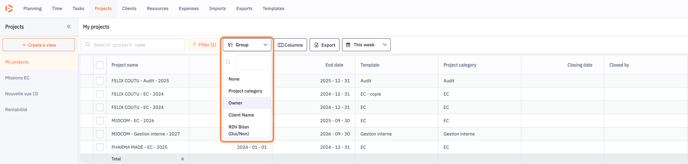 Select a grouping criterion from the Group menu (e.g., Client or Project).