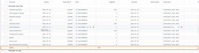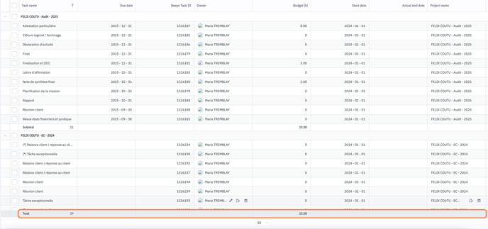 The grand total row appears at the very bottom. It automatically shows the total number of items in the view (for example, the total number of tasks).
