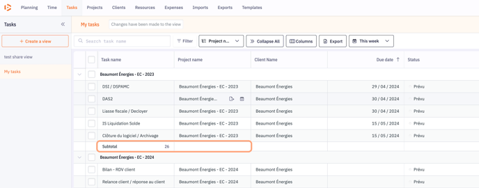 Tasks will automatically be grouped based on your selection, allowing you to view subsets of tasks and their totals by group.