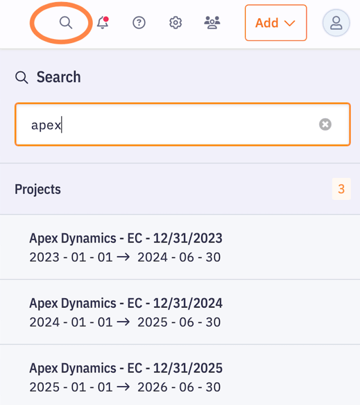 Use the quick search function at the top-right of the Beeye interface. Type the project name and select it from the results.