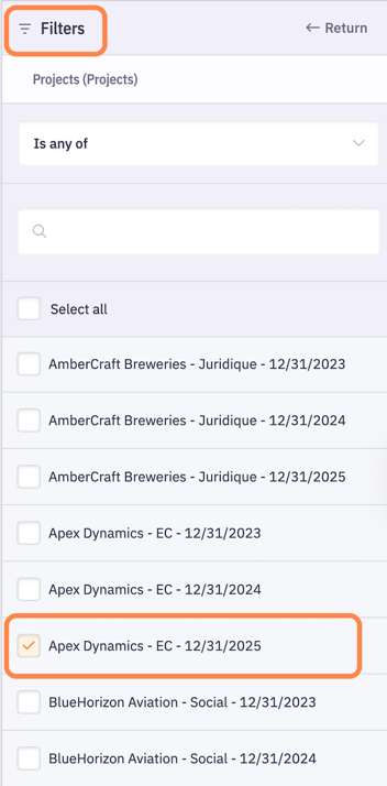 From the Planning Page : you can access a project’s schedule using the project filter. Various project-related filters are available, allowing you to select a specific element (for example: project name, project, etc.) and view the schedule associated with that project.