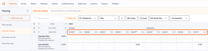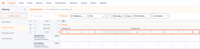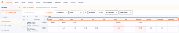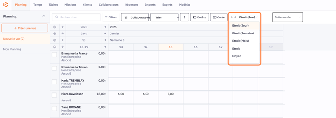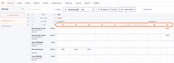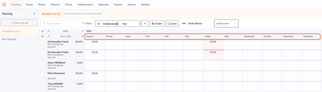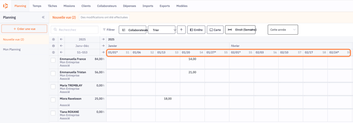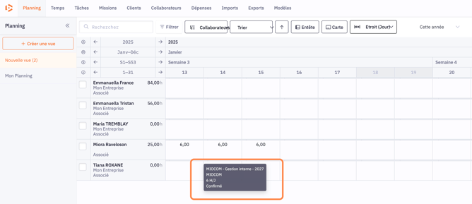 Astuce : Utilisez le mode Étroit mois pour évaluer la répartition mensuelle des ressources et identifier les périodes de surcharge ou de disponibilité.