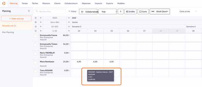 Ce mode affiche le total des heures planifiées par collaborateur sur un mois complet.