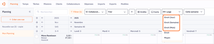 La page Planning de Beeye propose désormais trois nouveaux modes d’agrégation pour visualiser les temps planifiés selon différentes granularités : Étroit (Jour), Étroit (Semaine) et Étroit (Mois). Ces modes permettent d’adapter l’affichage en fonction des besoins : détail quotidien, suivi hebdomadaire ou synthèse mensuelle.