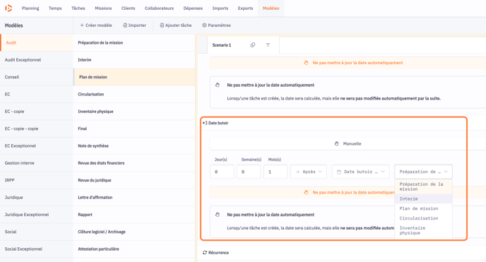 Cette date de référence peut être liée à une autre tâche, ou à des dates clés associées au client ou à la mission.