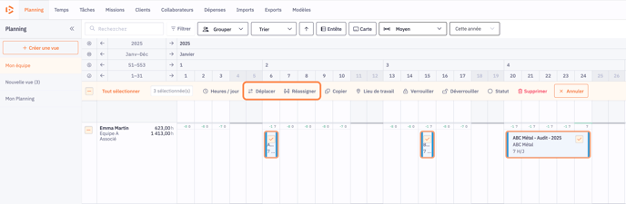 Cliquez sur Déplacer ou Assigner en haut du planning.