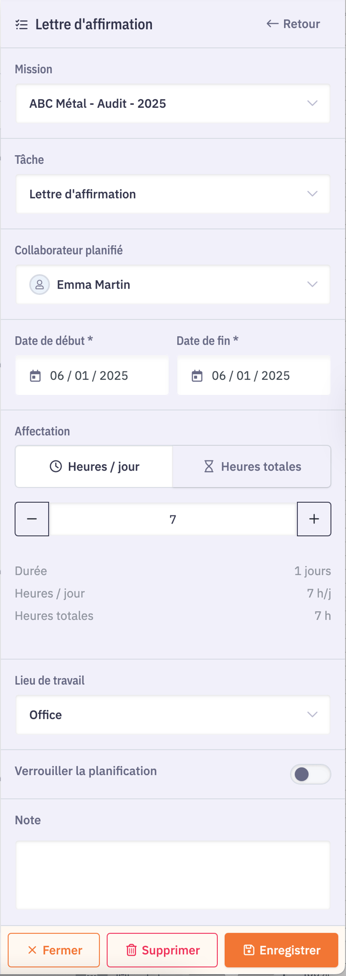 Dans ce panneau, vous pouvez modifier la date, le budget temps ou le collaborateur assigné.
