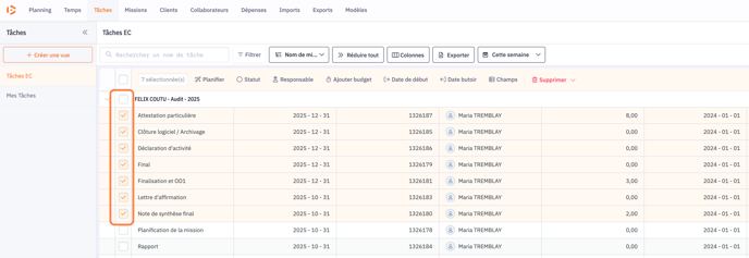 - Lancez l’action en masse souhaitée ; elle sera appliquée à toutes les lignes sélectionnées.