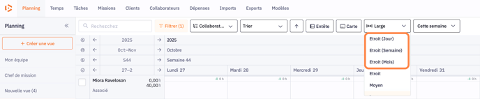 La page Planning de Beeye propose trois nouveaux modes d’agrégation pour visualiser les temps planifiés selon différentes granularités : Étroit (Jour), Étroit (Semaine) et Étroit (Mois). Ces modes permettent d’adapter l’affichage en fonction des besoins : détail quotidien, suivi hebdomadaire ou synthèse mensuelle.