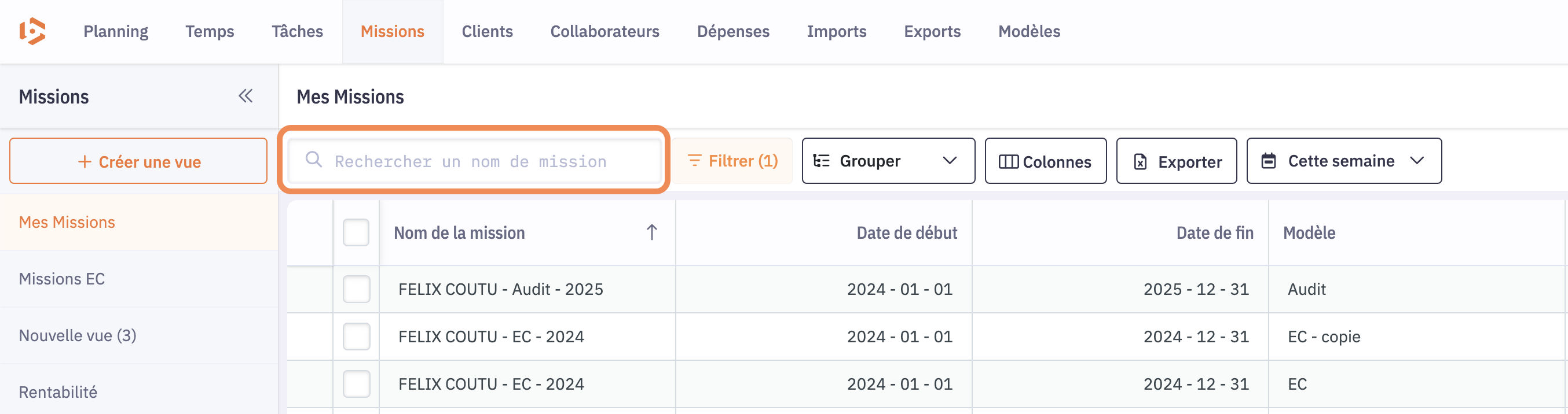 - Saisissez un mot-clé dans la barre de recherche située à gauche de la barre d’outils de la vue.