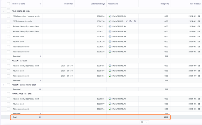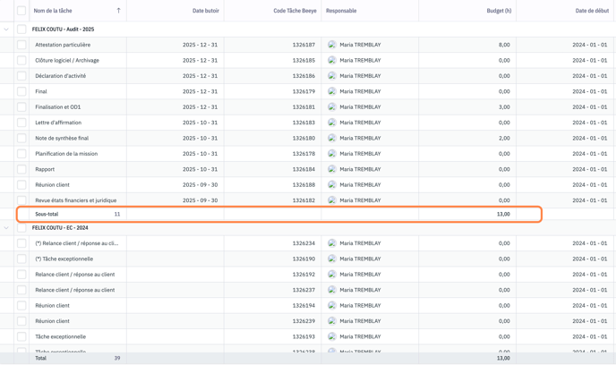 Les tâches seront automatiquement regroupées en fonction du critère choisi. Cela permet de voir les sous-ensembles de tâches et leurs totaux par groupe.