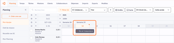 Beeye permet d’afficher directement dans le planning les jours non ouvrables, comme les vacances. Ces jours sont indiqués par un petit triangle orange dans le coin de la case, et le nom du jour férié apparaît au survol. Cela facilite l’identification des périodes sans disponibilité et permet de planifier efficacement les tâches tout en optimisant la gestion des ressources.