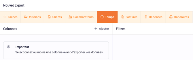 - Comme pour les temps, choisissez la période d’export et sélectionnez les champs à inclure dans l’export.