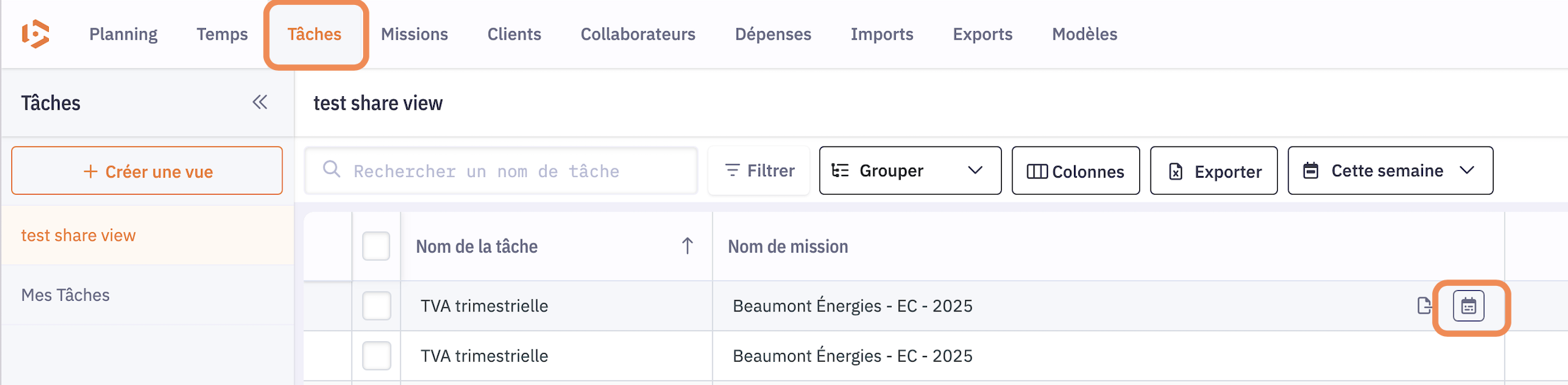 3- Dans la page Tâche : vous pouvez également accéder au planning en cliquant sur le bouton Planning situé à côté de chaque mission.