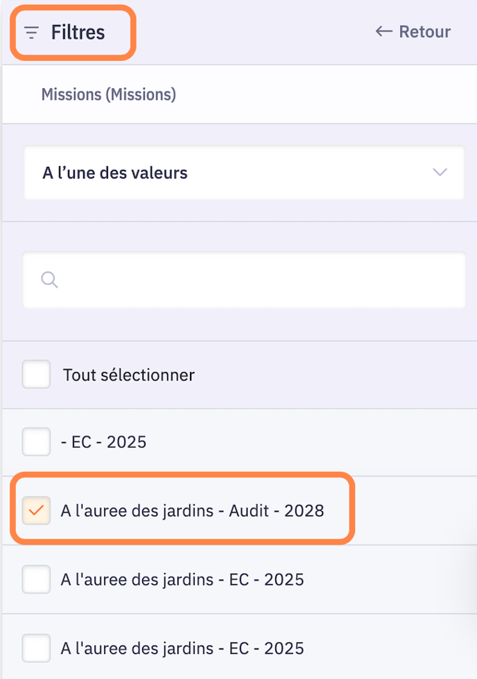 Différents filtres liés aux missions sont disponibles sur cette page, ce qui vous permet de sélectionner un élément spécifique (par exemple : nom de mission, mission, ...) pour consulter directement le planning associé à la mission.