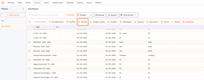 2. Utiliser les différents possibilités de filtrage au besoin pour afficher uniquement les missions que vous souhaitez planifier automatiquement