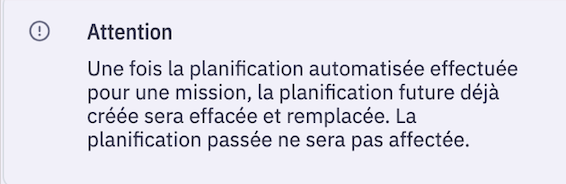Une fois la planification automatisée effectuée pour une mission, toute la planification future déjà créée sera effacée et remplacée.
