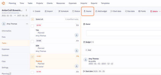 - You can assign both an Owner person (who supervises the task) and a collaborator (who will work on the task). Collaborator settings are configured at the budget level in the task options.