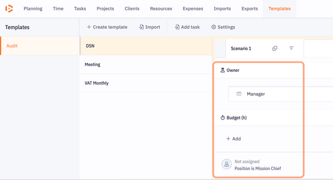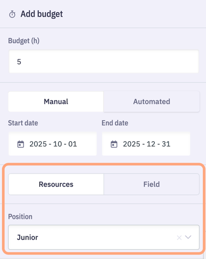 Resource parameters can also be defined, and their automatic assignment is configured in the Budget section of the template.
