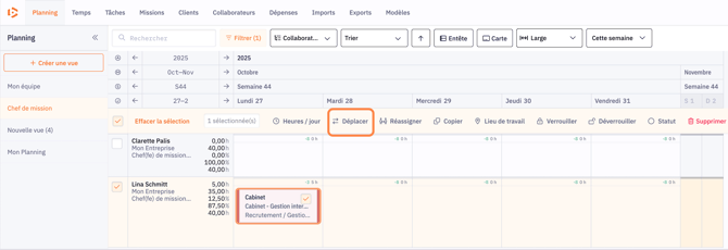 Astuce : vous pouvez déplacer la planification pour l’ensemble de l’équipe ou seulement pour un collaborateur. Il est également possible de réassigner la planification à une autre personne.