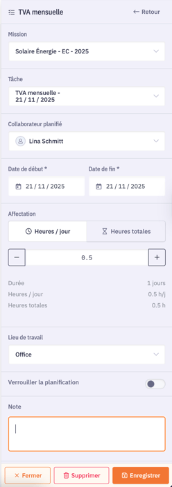 Enregistrement : Une fois la note saisie, cliquez sur le bouton d'enregistrement pour l'ajouter à la tâche. L'information sera désormais visible pour tous les utilisateurs ayant accès à cette tâche dans le planning.