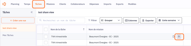 3- Dans la page Tâche : vous pouvez également accéder au planning en cliquant sur le bouton Planning situé à côté de chaque mission.
